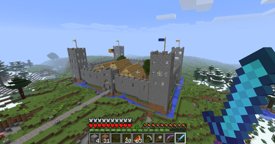 Here is a fully livable castle. It includes an on/off switch for the moat (I also have a lava moat switch, but that one has problems) and a bar-and-piston gate that opens (3 wide, 2 tall). It has all the amenities to be a home base (farm, animals, workshop, bed, etc.) plus some decorative rooms and plenty of rooms for soldiers. It also has a railroad station. Roads come out both north and south, the south one leading to a village not too far away. The railroad is well over a 1000 meter journey from my coastal mansion to here, then continues to further areas.