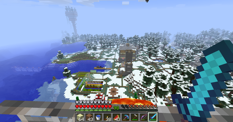Here's the aforementioned Coastal Estate, as seen from the top of my lighthouse tower (lava and water flowing down from it). This is my first base, with the cobblestone tower being the most livable and the mansion beside it being mostly for show, including a large dance floor and basement exhibits.