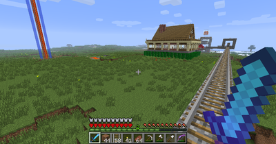 Here's the house, kinda mansion, that I built in the hardcore-mode game I played. I designed this one to be very practical, rather than for show, so I could actually live in the mansion. It has a raised railroad network to head out to my favorite working locations in relative safety, and has several other safety features allowing me to see mobs coming before I go out my door. The cactus also kills mobs rather than letting them accumulate.