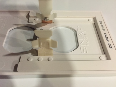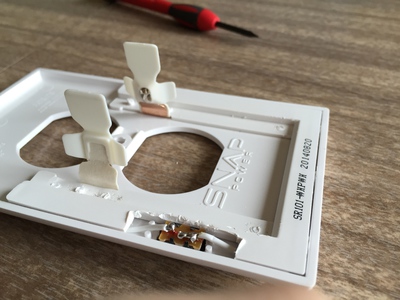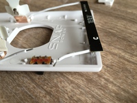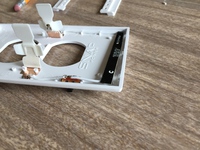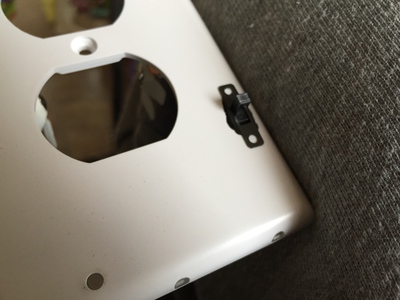 The plastic backing doesn't quite fit over the switch. So I marked the area and cut it out with a razor, making slices for the sides and using pliers to bend up the plastic to remove and break it off. Then I was able to get the backing back on. Push it so the remainder of the plastic pegs go into the holes and push down around those with the end of the pliers to make sure it is in there snugly.
