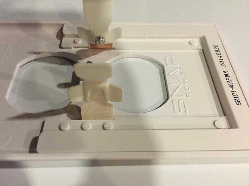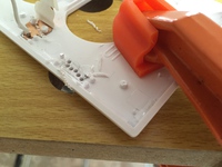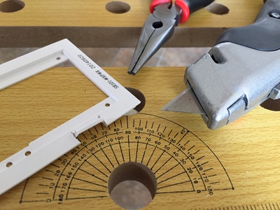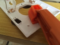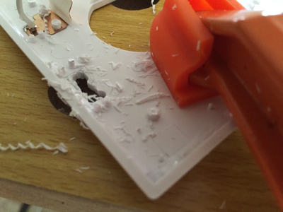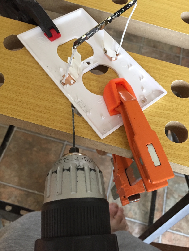 Start by drawing the rectangle to cut out by tracing around the switch on the back of the plate. Then clamp this down to a saw horse so you can safely drill through it. You want sufficient support on the plastic so that you won't crack it either.