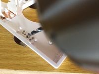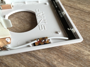 Turn the guide light over and you see a backing that covers up the wires and the light circuitry at the bottom. There are round plastic fasteners with tabs on the tops that hold this in. Unfortunately you have to break those tabs off, then you can pry this backing up with a flathead screwdriver.